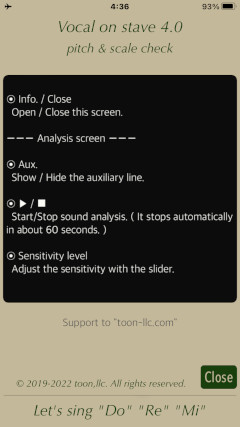 The basic operation of this app is very simple, just tap START button. If necessary, adjust the sensitivity level according to the volume of your singing voice.