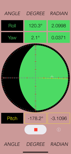 It utilizes the information of the acceleration sensor, and operates as 3-dimensional inclinometer. It displays the angle and gradient in visually in accordance with the spatial attitude of the iPhone devices. By tapping Start button to start the measurement, and it then stop by tapping Stop button.