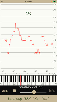 iPhoneの内蔵マイクに向かって歌うだけで、ボーカルの基本ピッチが五線譜上にリアルタイムで表示されます。